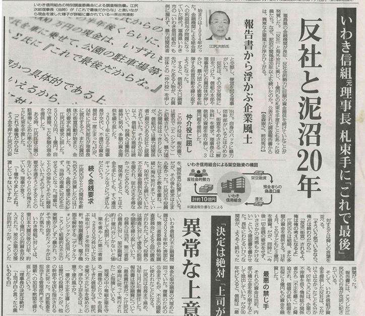 『その際には、古巣の人脈を駆使した結果でしょうか、さまざまな右翼団体、暴力団関係者が押しかけ、彼らには少なからざる資金が渡っています。また、〇〇氏はいわき信組がメーンバンクだった仙台の産廃業者も乗っ取り、ここが巨額の負債を出してもいます』(地元事情通)