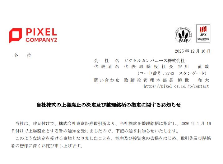周知のように、「ピクセルカンパニーズ」(2743。東証スタンダード。東京都港区)の上場廃止が12月15日に決まった。