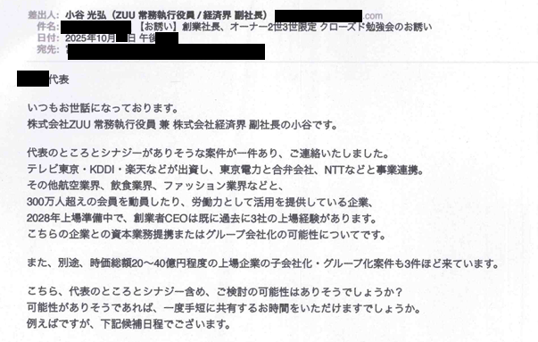 このメールを送った常務執行役員の企業「ZUU」(4387。東京都港区。冨田和成代表取締役)は、今年3月、月刊誌『経済界』を発行する㈱「経済界」を子会社。経営者中心の読者基盤生かし、相互の顧客紹介や一体型の提案も強化する東証グロース上場企業だ。こんな提案を受けたら、ともかく話を聞いて見ようとなるのではないだろうか。