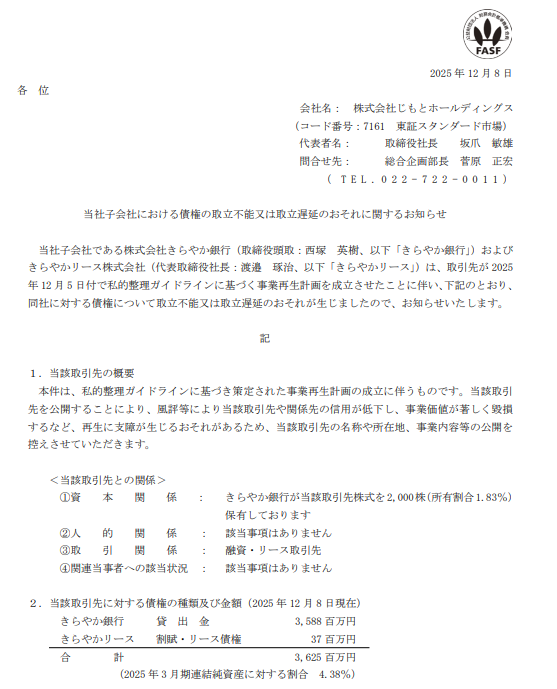 このような負の流れも、コメどころ山形はコメ騒動では潤ったものの、昨年12月8日、じもとHDは子会社であるきらやか銀行に関して「債権取立不能又は取立遅延のおそれに関するお知らせ」をIR(右横写真)。損失は約36億円。融資先破綻などに備えた引当金が主だが。それは米穀会社だという噂だ。地元では数社噂になっているようだが、確定できないため企業名は伏せておく。昨年のコメ騒動に味を占めて売り惜しみした結果、在庫を抱えてしまったということではないか。