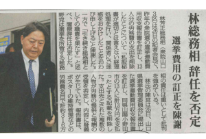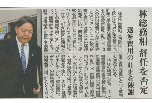 こうしたなか、12月25日、林氏の陣営はこの選挙運動費用収支報告書につき、山口県山陽小野田市の13人に支払ったとする計13万円は誤りとして訂正。翌日の記者会見で、「林総務相 辞任を否定」と大手マスコミでも報じられている(冒頭写真は「毎日」12月27日)が、これは決してオーバーな表現ではない。