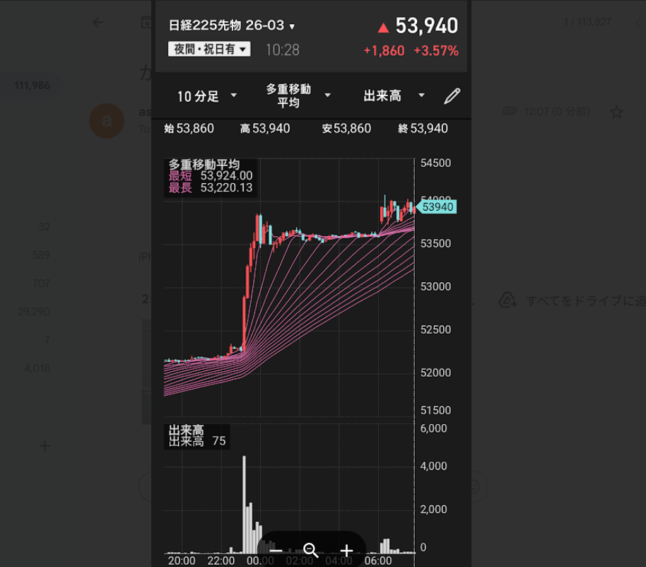ただ日経平均をドル建てでみた場合、現在の最高値は2025年11月4日につけた342.7ドルである。そこで現在のドル建て日経平均先物の値を算出してみると、53,940円(※12日AM10:00)÷157.86円 = 341.7ドルとなっておりまだ史上最高値を越えていない。海外勢はドル建てで日経平均を見ているので、ざっくり158円×342.7ドルで54,147円程度が高値となる可能性も高いので、ここから指数を買うのは得策ではないと考えている。買うなら54,150円を明確に越えてからだろう。