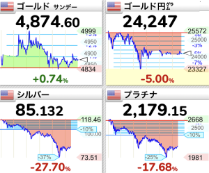 特に「銀」は一時、-35%もの急落(※3分の1以上)となっての-27.7%安のため、ここまで下がってしまった以上逃げ遅れの保有者も多いだろうから、今週下げ止まるのかはまったく見えてこない。