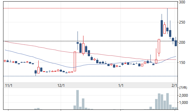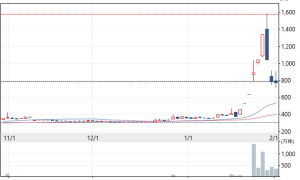 しかし、1月28日ストップ高している時、筆者に「関係者は一部売っている」と連絡が来た。そして翌29日は買い気配で始まり大幅高も一転急落し1040円のストップ安となった。恐らく28、29日ですべて売り捌いたのだろう。