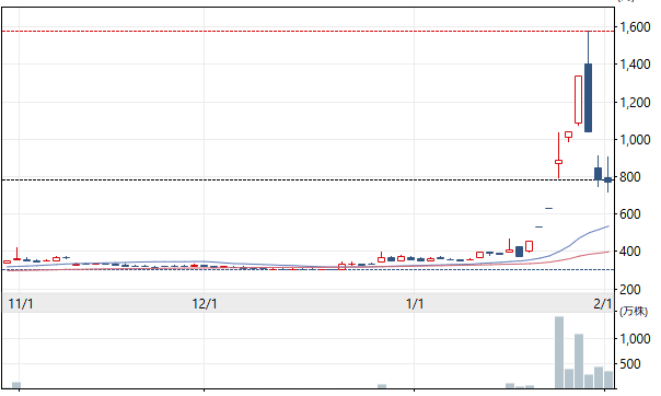そして、同銘柄は今年1月中旬から突然急騰しはじめ、ストップ高4回を交え、350円辺りから1月29日には1580円まで暴騰している(冒頭写真)。