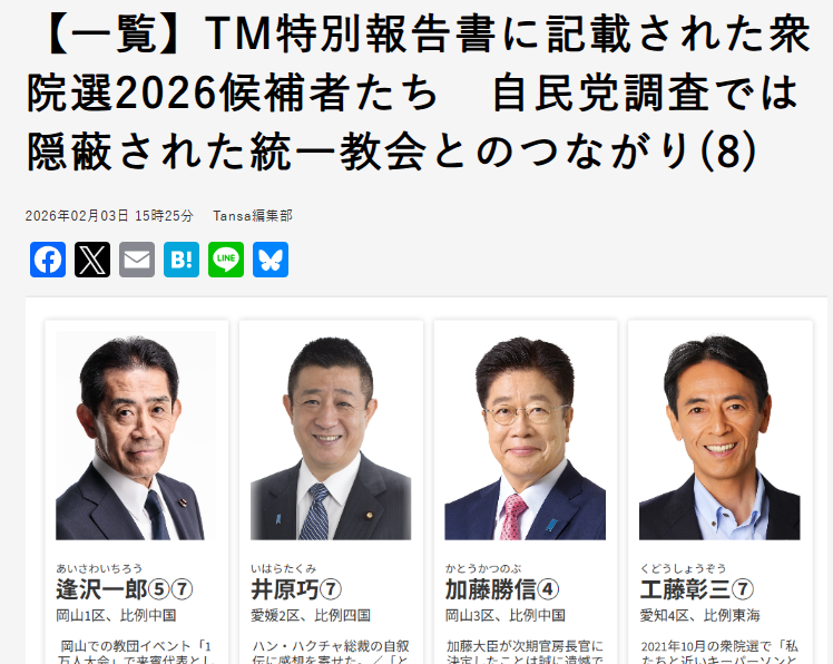 このTansaが、この衆院選期間中も毎日のように精力的に報じているのが、例の旧統一教会の「TM特別報告書」を基にした同団体と自民党との癒着(*ココをクリックすれば観えます。全文無料)。