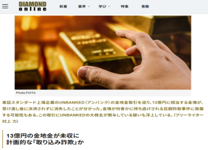 本紙では今年に入り、金地金販売と法人向け貸金が柱「UNBANKED」(旧「第一商品」。8746。東証スタンダード。東京都渋谷区)の件を3度報じている。