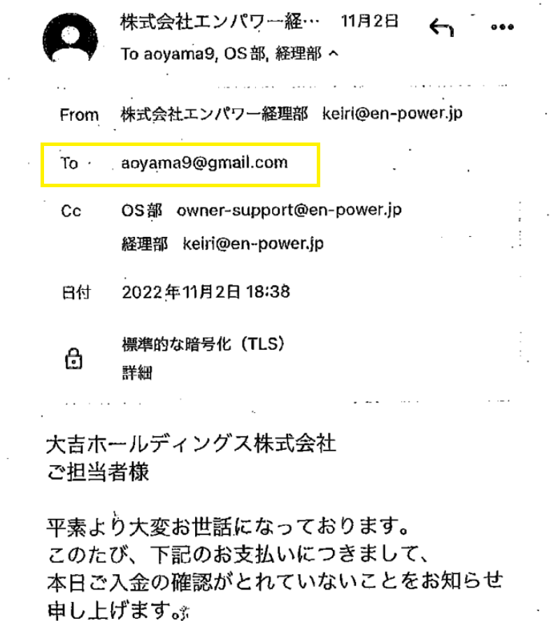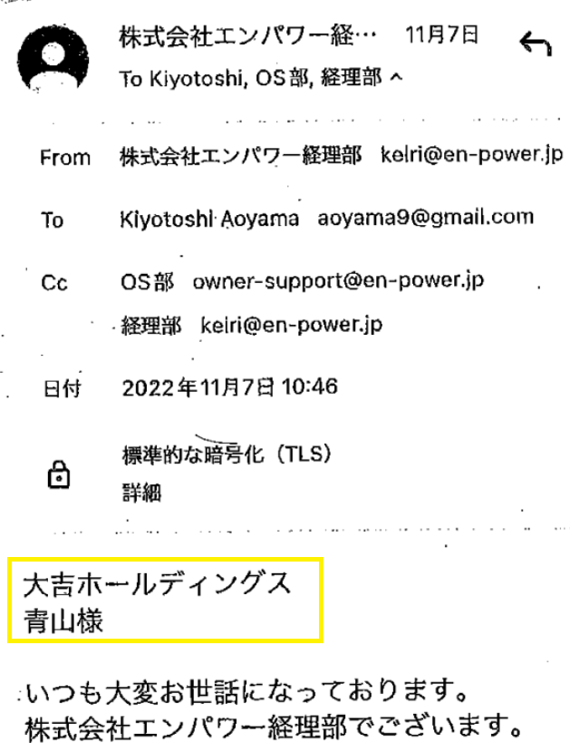 また、メールのやりとりで、大吉(当時は大吉ホールディングス)の青山氏宛に出したものまである。表向きの代表は前述のように増井俊介氏だが、エンパワー内部では青山氏がオーナーであることは周知のことだったのであろうか?