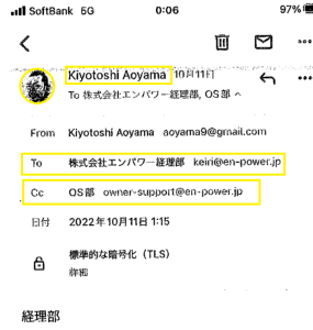 ご覧のように、このメールのやりとりにおいて、エンパワー経理部は実際にその高級マンションを借りている青山服役囚個人にメール送付したり、逆に青山服役囚個人がエンパワー経理部に送付したり、または青山服役囚がオーナーであることから、その青山服役囚をサポートする専門部署があったみたいで、そこがCCとなっていたりしていたのだ。