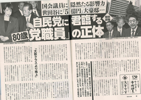 また、新潮記事は元宿氏が一度だけメディアに大きく取り上げられたのが日歯連1億円献金事件だとしているが、本紙では当時、その判決要旨を紹介していて、そこに「自民党経理部長兼事務局長として献金実務を切り盛りしていた元宿に捜査の手が及んで」との記載がある。