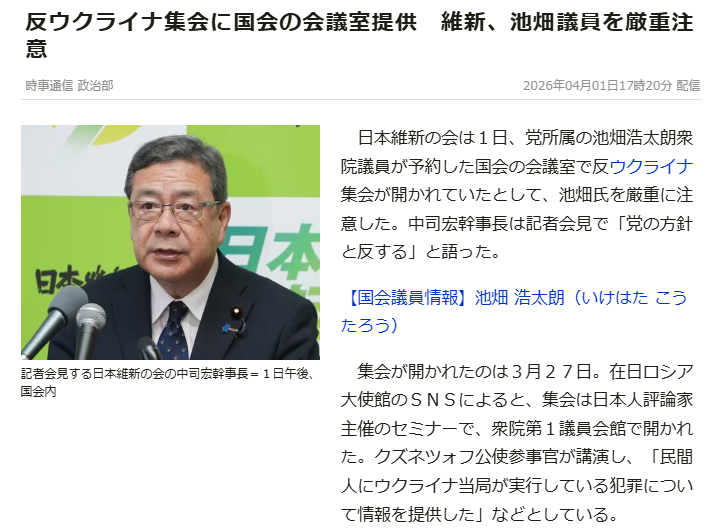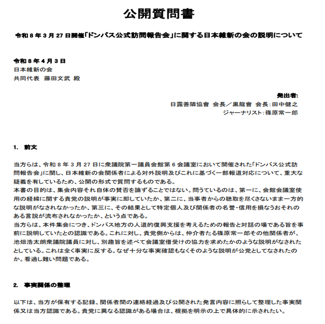 3月27日、衆議院第一議員会館会議室で「反ウクライナ集会」が開催された件で、会議室を予約した「維新」所属の池畑浩太朗衆議院議員が、知り合いに“別目的”(拉致問題に関する映画関係者によるイベント)を言われ予約したと釈明していた件--これに対し、同集会の主催者(日露善隣協会)側は、ウクライナ戦争に関する件(「ドンバス訪問報告会」)とキチンと伝えていたと猛反発。なぜ「虚偽」のことを言うのかと、主催者側が維新に公開質問状を出していたことは本紙既報の通り。