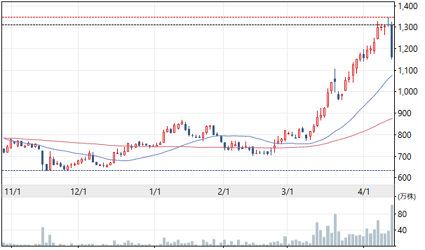 一方、グローバル総合配線メーカー「オーナンバ」(5816。東証スタンダード。大阪市中央区)は4月10日に大幅高で上場来高値を更新(右写真)。仕掛けたのは短期の日本人グループだという。一部投資顧問も便乗したようだ。