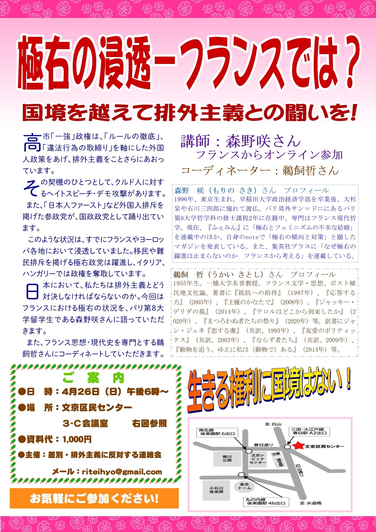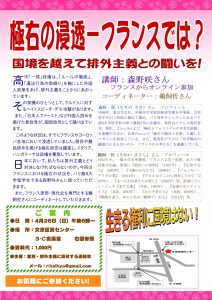 差別・排外主義に反対する連絡会は、このフランスの極右勢力の動向に詳しい日本人留学生を講師に、またフランス思想に詳しい鵜飼哲氏(一橋大学名誉教授)をコーディネーターに、下記の通り学習会を企画している。関心のある方は足を運んでみることを勧める。