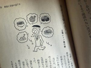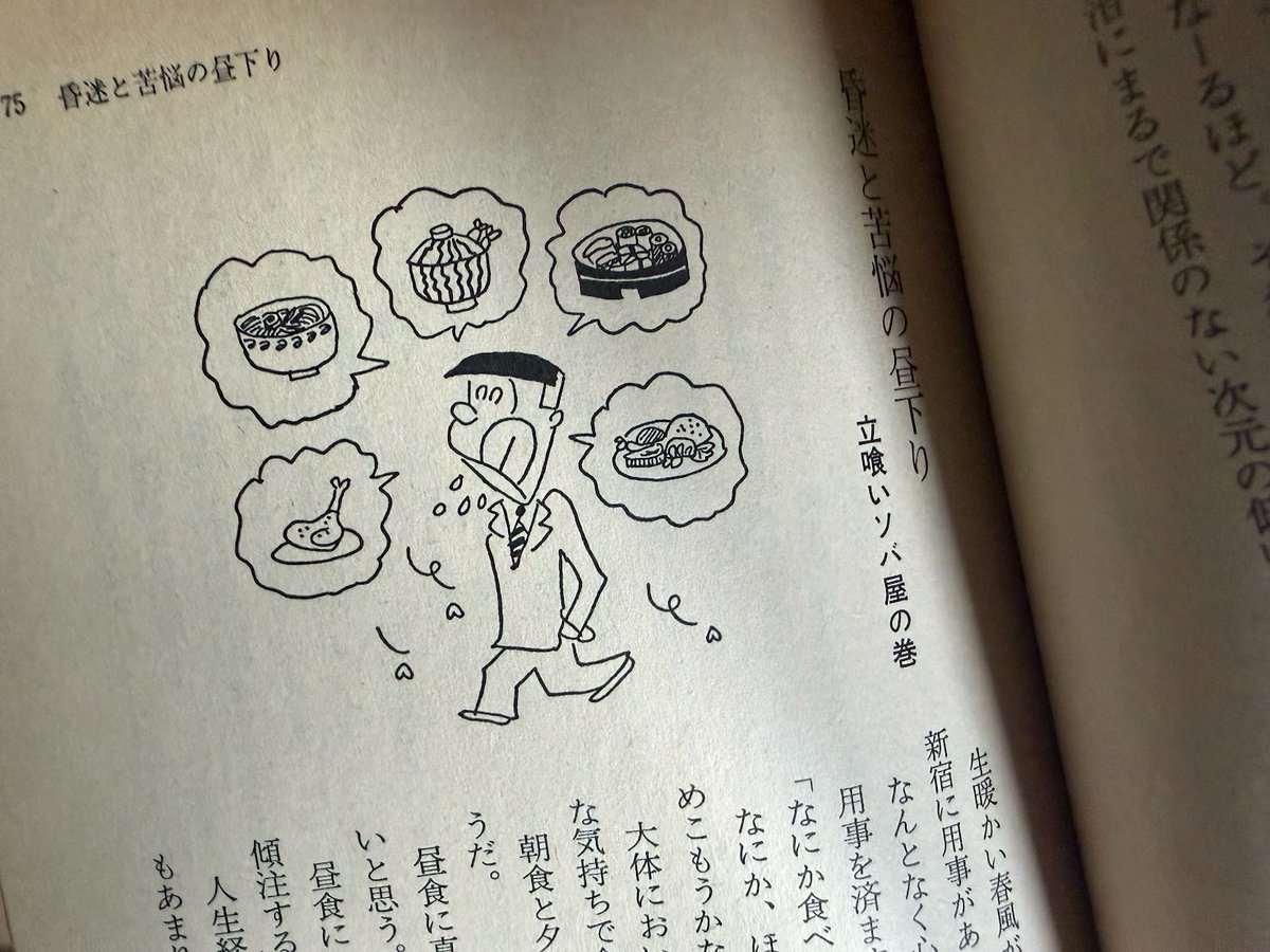 著名人の食のエッセイは、どこそこのあれが美味かったという話がほとんどだが、ショージ君は違う。たとえば「昏迷と苦悩の昼下がり」という章では、新宿にてその日の昼食(外食)をどうするか、汁系にするか肉系にするか、いや中華系か…。店先を巡りながら決めかねて迷い悩み、「一体自分は何のために歩いているのかさえわからなくなってきた」と「昏迷と惑乱と、逡巡と苦悩と疲労の1時間半」を費やした末に、最後に新宿駅の立ち食いそばでかけそばを食って救われたという顛末が、シュールな不条理世界に入ったかのようなスリリングなタッチで描かれる。凄いのは半世紀以上経っても「分かる分かる」と共感できるところだ。