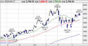 また少なくても今週は特に強気で望むべきだ。テクニカルの項で後述しているが、4月2週目の海外勢の売買投資動向をみると、個人投資家が-7,857億円の売り越しであったが、外国人投資家は+1兆5469億円の超大型買い越しである。これは典型的な、相場上昇のサインであることは本稿で、何度も記してきた。