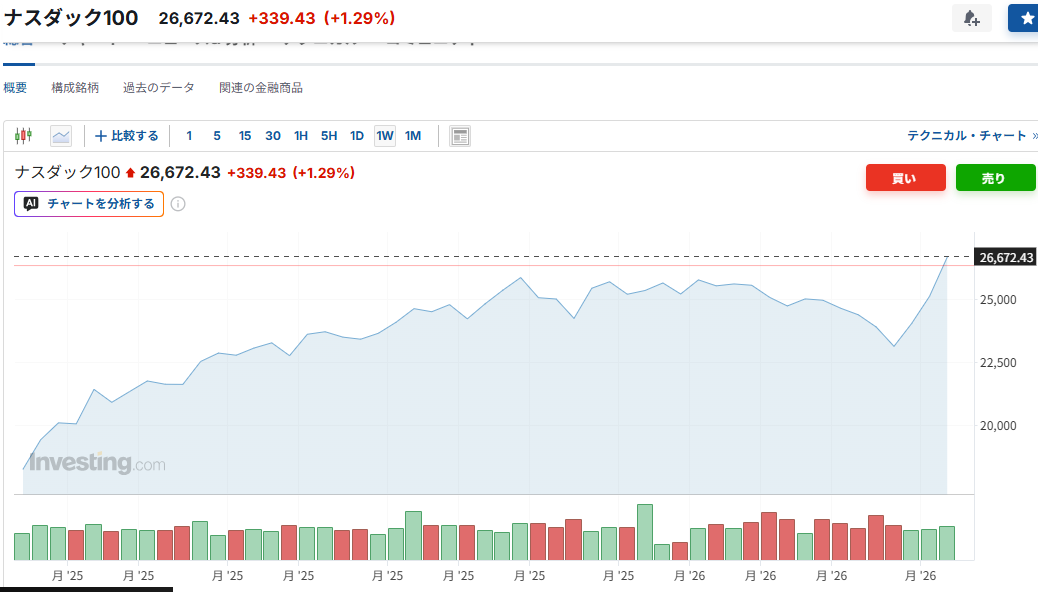 ナスダック100指数は26,672Pと、前稿比+1,556P高(※前稿比+1071→+912→▲765→▲483→▲262→▲317→▲52→+279→▲343→▲476→▲53→+76→+237→+560→▲140)であった。※現在が最高値。2025年4月7日に16,542ドルが直近最安値。